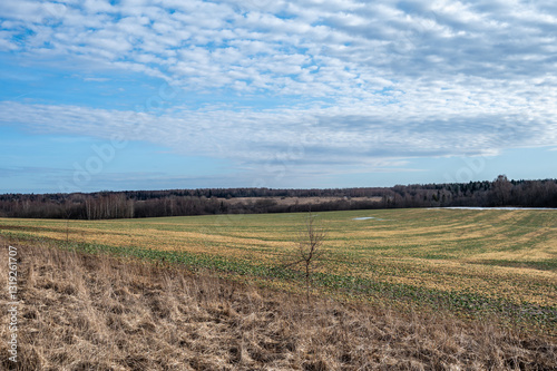 © Andrey Nikitin, Obraz premium Aerial sunny spring landscape with large field, far forest under blue sky with white clouds. Natural spring background.
