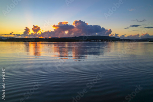 © Merrillie, Naklejka premium Aerial sunrise over the bay with clouds and reflections
