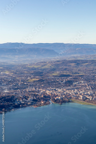 © nomadkate, Fototapeta premium Aerial sunrise view of Annecy lake waterfront and old town with landmarks, France