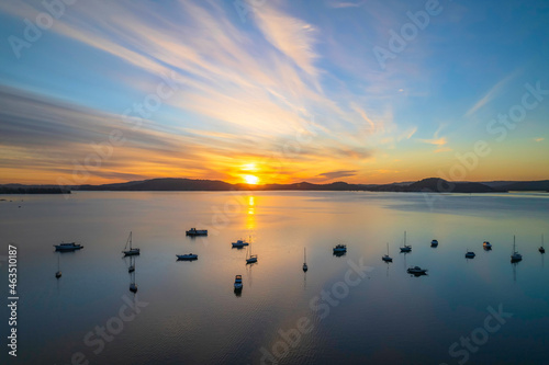 © Merrillie, Naklejka premium Aerial sunrise waterscape with boats and high cloud