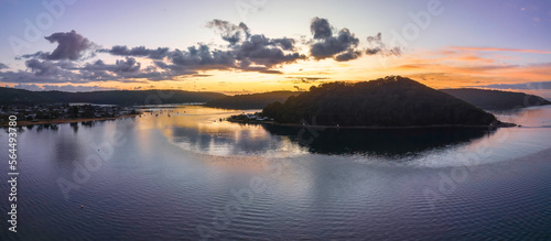 © Merrillie, Fototapeta premium Aerial sunrise waterscape with boats and scattered clouds
