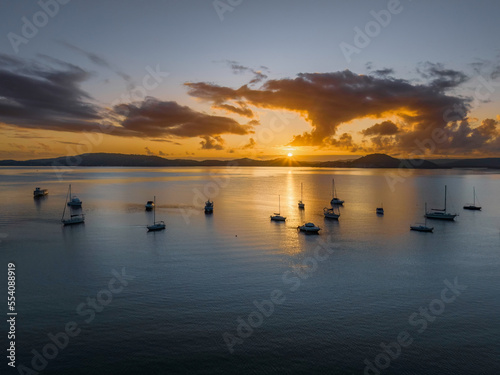 © Merrillie, Naklejka premium Aerial sunrise waterscape with boats, clouds and reflections