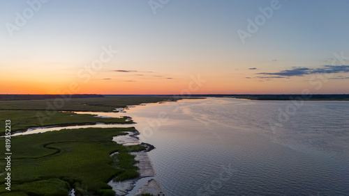 © Nate.Rosso, Fototapeta premium Aerial sunset along river with marsh grasses landscape