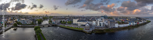 Naklejka premium Aerial sunset panorama of Galway, harbor city on Ireland’s west coast River...