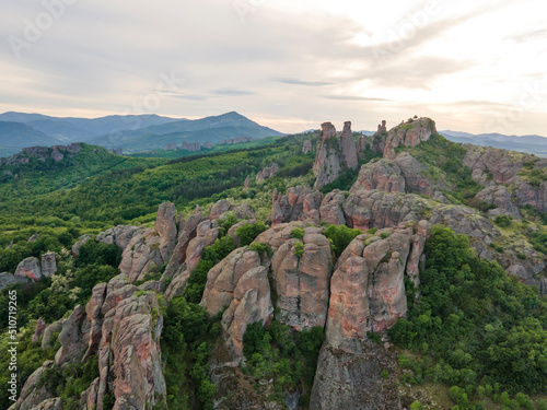 Fototapeta premium Aerial Sunset view of Belogradchik Rocks, Bulgaria