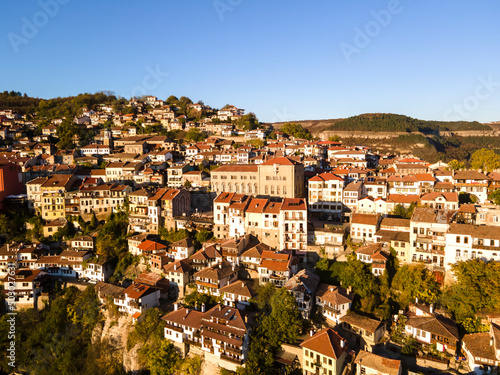 © Stoyan Haytov, Fototapeta premium Aerial Sunset view of city of Veliko Tarnovo, Bulgaria