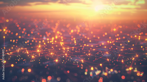 Fototapeta premium Aerial Sunset View of Financial District, Glowing Network of Lines Representing Wealth Distribution,