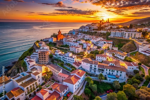 © Supittra, Fototapeta premium Aerial Sunset View of Torrox, a Picturesque White Town on Costa del Sol, Showcasing Mediterranean Charm and Ocean Views in Andalusia, Spain