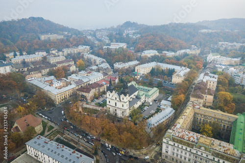 Naklejka premium Aerial: The church of Saint Arkhystratyh Michael in Lviv in misty weather