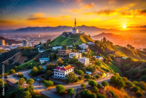 © Sirinporn, Fototapeta premium Aerial Tilt-Shift Sunrise: Hollywood Hills & Taekwondo Symbol