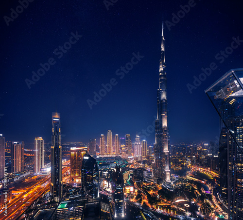 © Parilov, Fototapeta premium Aerial top view Dubai, night amazing skyline cityscape with illuminated skyscrapers, neon color. Modern downtown United Arab Emirates, sky with stars