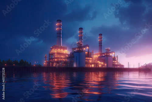 © TANATPON, Fototapeta premium Aerial top view industry petroleum station with beautiful sky background, gas and oil refinery tank for process, Manufacturing of industrial with Generative AI.