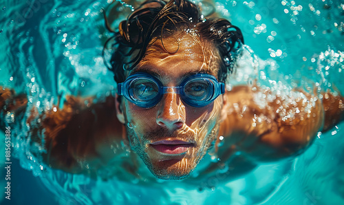 Fototapeta premium Aerial Top View Male Swimmer Executing Butterfly Stroke in Pool, Focused Athlete Training for Championship, Professional Sportsperson in Action, Determined Expression Underwater, Clear Daytime Setting
