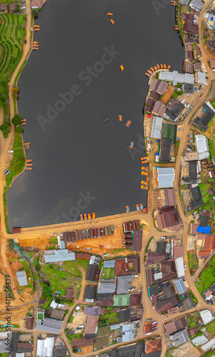 © Narong Niemhom, Naklejka premium aerial top view of a lakeside village, showcasing a mix of rustic architecture, lush greenery, and boats scattered across the calm water. A harmonious blend of natural beauty and human settlement..