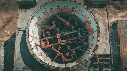 © DedMityay, Fototapeta premium Aerial top view of abandoned and ruined Nuclear Power Plant. Large industrial construction with round tower of atomic reactor, post-apocalypse and world war concept, drone shot.