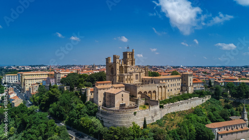 © Iuliia Sokolovska, Obraz premium Aerial top view of Beziers town architecture and cathedral from above, South France