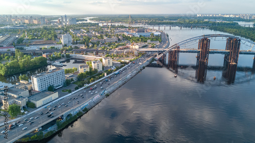 © Iuliia Sokolovska, Fototapeta premium Aerial top view of Dnepr river and Rybalskiy island from above, bridges and skyline of Kiev city, Ukraine