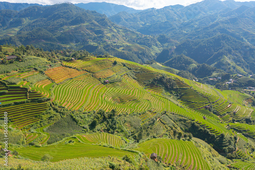 Fototapeta premium Aerial top view of fresh paddy rice terraces, green agricultural fields in countryside or rural area of Mu Cang Chai, mountain hills valley in Asia, Vietnam. Nature landscape background.