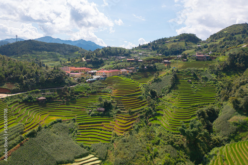 © tampatra, Fototapeta premium Aerial top view of fresh paddy rice terraces, green agricultural fields in countryside or rural area of Mu Cang Chai, mountain hills valley in Asia, Vietnam. Nature landscape background.
