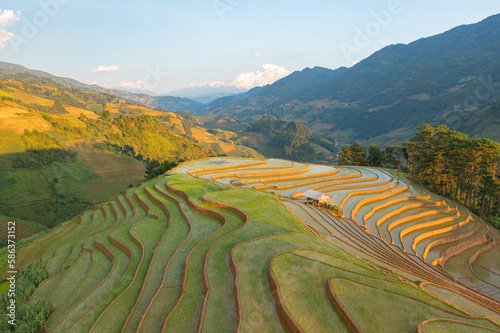 © tampatra, Fototapeta premium Aerial top view of fresh paddy rice terraces, green agricultural fields in countryside or rural area of Mu Cang Chai, mountain hills valley in Asia, Vietnam. Nature landscape background.