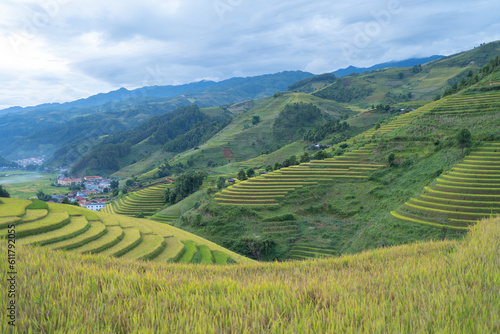 Fototapeta premium Aerial top view of fresh paddy rice terraces, green agricultural fields in countryside or rural area of Mu Cang Chai, mountain hills valley in Asia, Vietnam. Nature landscape background.