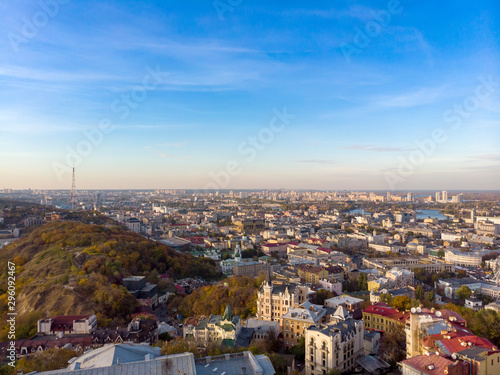 © Igor, Naklejka premium Aerial top view of Kyiv cityscape of Vozdvizhenka and Podol historical districts on sunset from above, city of Kiev, Ukraine