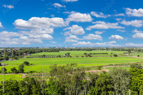 © gamjai, Fototapeta premium Aerial top view of Paddy field with cloudy sky.