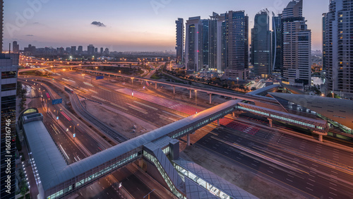 Fototapeta premium Aerial top view to Sheikh Zayed road near Dubai Marina and JLT night to day...