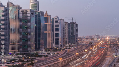 Fototapeta premium Aerial top view to Sheikh Zayed road near Dubai Marina and JLT night to day timelapse, Dubai.