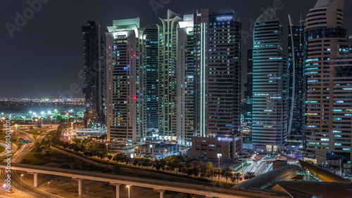 Obraz premium Aerial top view to Sheikh Zayed road near Dubai Marina and JLT timelapse, Dubai.