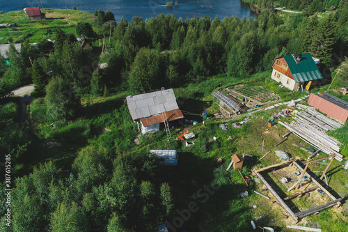 © AAMiX, Naklejka premium Aerial Townscape of Suburban Village Kolvica located in Northwestern Russia on the Kola Peninsula Kandalaksha Area