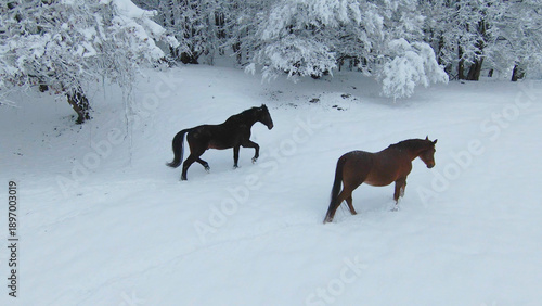 © helivideo, Fototapeta premium AERIAL: Two beautiful brown horses walking on a freshly snow-covered meadow