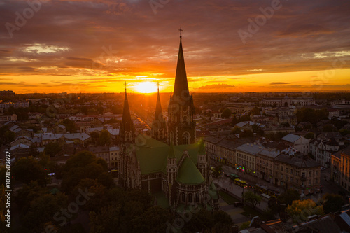 © Ruslan, Obraz premium Aerial veiw on Elizabeth church in Lviv, Ukraine from drone.