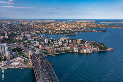 © Todayphoto, Fototapeta premium Aerial view along the Sydney Arch Bridge across the Tasman Sea of the city's modern buildings.