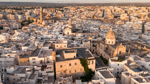 Obraz premium Aerial view ancient mediterranean town, houses church bell tower at sunrise, Monopoli, Puglia, Italy