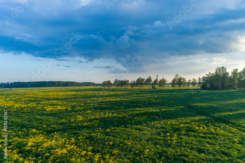© alexkazachok, Fototapeta premium Aerial view at sunset on a field with long shadows from trees