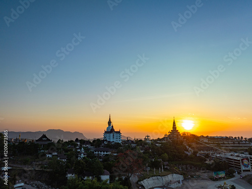 © Narong Niemhom, Fototapeta premium Aerial view beautiful golden pavilion at Wat Phachonkeaw at sunrise..5 sitting buddha statues of Phachonkeaw on Khao Kho hill the beautiful landmark .and famous in Phetchabun Thailand.