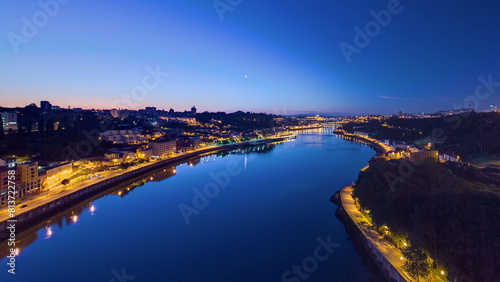 © HyperlapsePro, Fototapeta premium Aerial view before sunrise at the most emblematic area of Douro river timelapse.