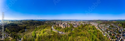 Fototapeta premium Aerial View, Braunfels Castle, with Hubertus Tower, New Hesse, Germany,