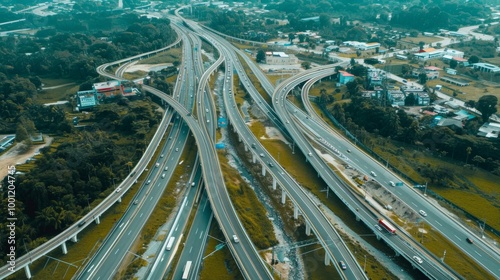Naklejka premium Aerial view capturing a well-organized network of highways weaving through a city's suburban region, surrounded by greenery and urban elements harmoniously.