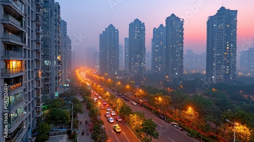 © Artsaba Family, Fototapeta premium Aerial view: city lights, traffic. Tall buildings overlook busy street. Cityscape with modern architecture and urban life