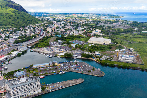 © David Brown, Obraz premium Aerial view, city view of Port Louis with harbor, old town and financial district, Mauritius