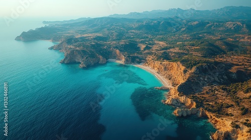 © Hafidz, Fototapeta premium Aerial view Coastal cliffs, turquoise bay, Greece