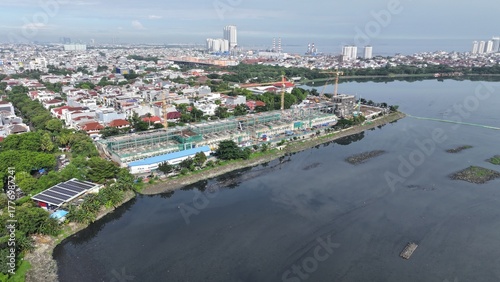 © Enggartiasto, Obraz premium Aerial view Construction site with a crane and a large building in the background. The crane is on the left side of the image and the building is on the right side. middle city