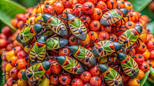 © renuga sachan, Fototapeta premium Aerial View: Cotton Harlequin Bug Nymphs on Illawarra Flame Tree Seed Pods, Queensland, Australia