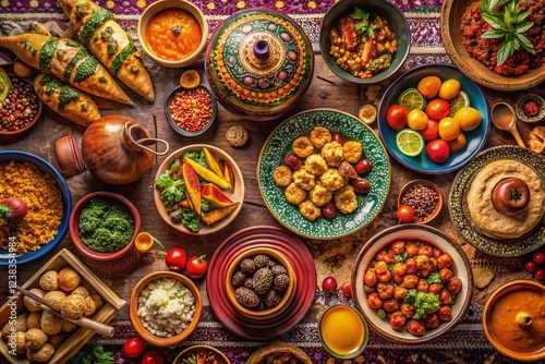 © Danicha, Fototapeta premium Aerial View: Festive Moroccan Feast, Colorful Dishes & Spices