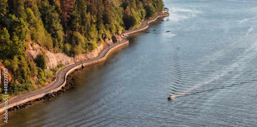 © edb3_16, Obraz premium Aerial View from Lions Gate Bridge of Famous Seawall in Stanley Park. Sunny Summer Sunset. Downtown Vancouver, British Columbia, Canada.