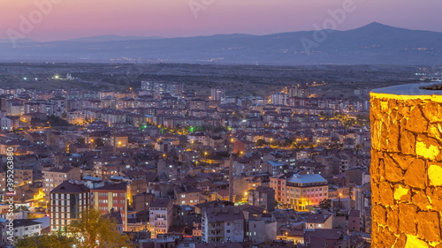 Obraz premium Aerial view from old castlethe in historical city town of Nevsehir day to night timelapse