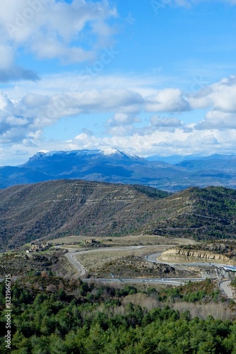 Fototapeta premium Aerial view from summit on Pyrenees mountain range. Early spring, vivid...