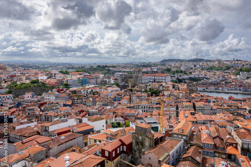 © Fotokon, Fototapeta premium Aerial view from tower of Clerigos Church in Porto city, Portugal with Se Cathedral, Douro River and Vila Nova de Gaia city